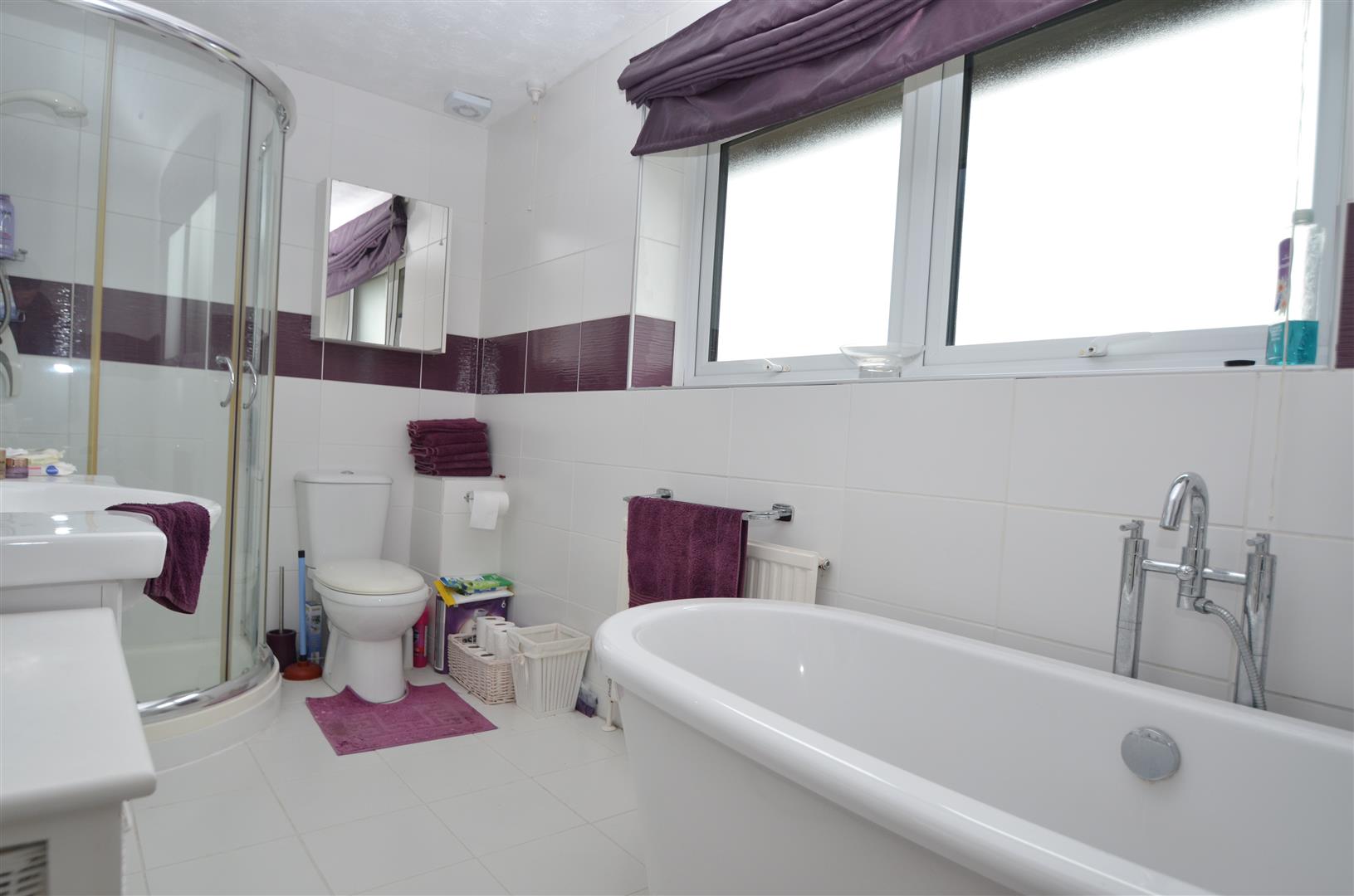 En suite Fully tiled and fitted with a white suite comprising: Shower quadrant with electric shower over. Free-standing bath with mixer taps and shower attachment. Low level close coupled wc and vanity unit with inset wash hand basin. Radiator, extractor fan and UPVC double glazed window to the front.