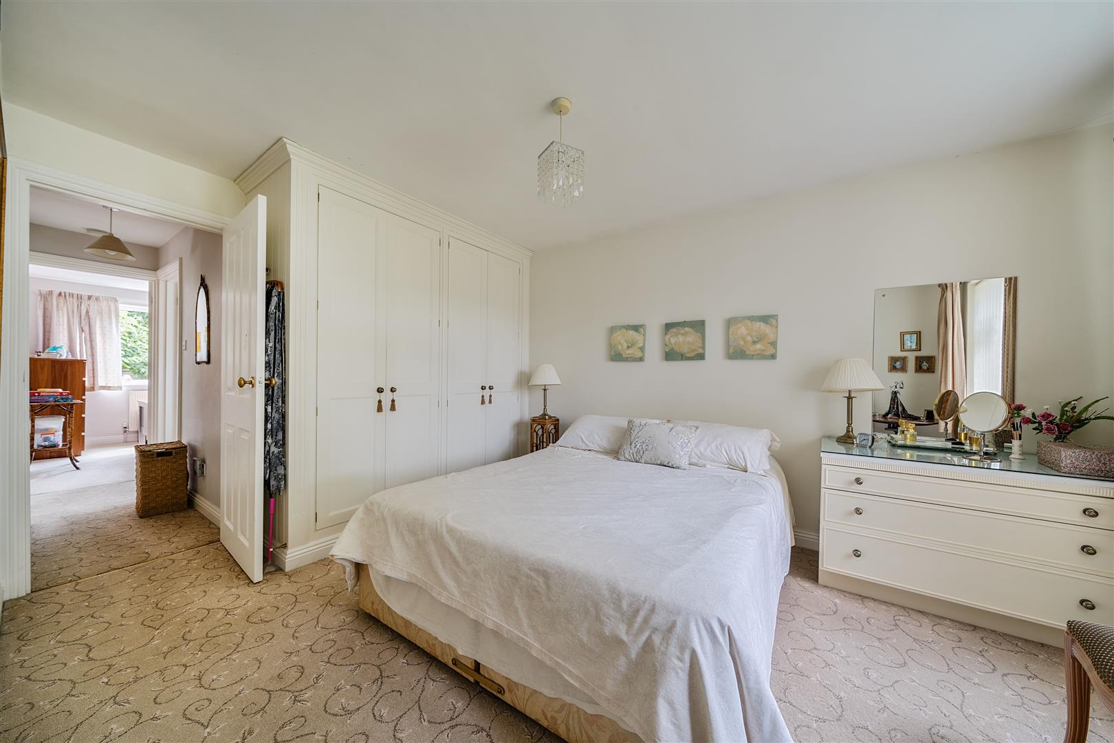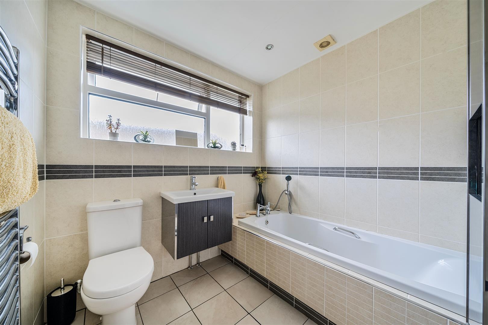 En Suite Tiled and fitted with a white suite comprising; large walk in shower with thermostatic shower and glazed screen over, ceramic pedestal hand wash basin with mixer taps and low level W.C. Tiled floor and heated towel rail.