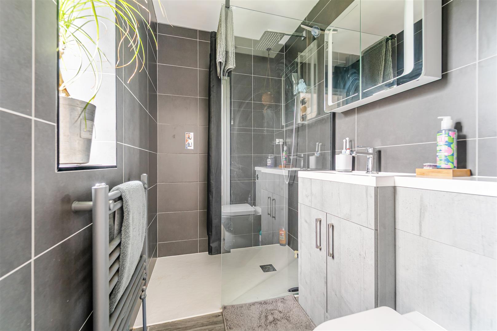 En Suite Shower Room Fully tiled and fitted with a white suite comprising; Large walk-in shower with thermostatically controlled shower over. Concealed low level wc and wash hand basin with storage beneath. Heated towel rail, mirror with light and UPVC double glazed window to the rear.