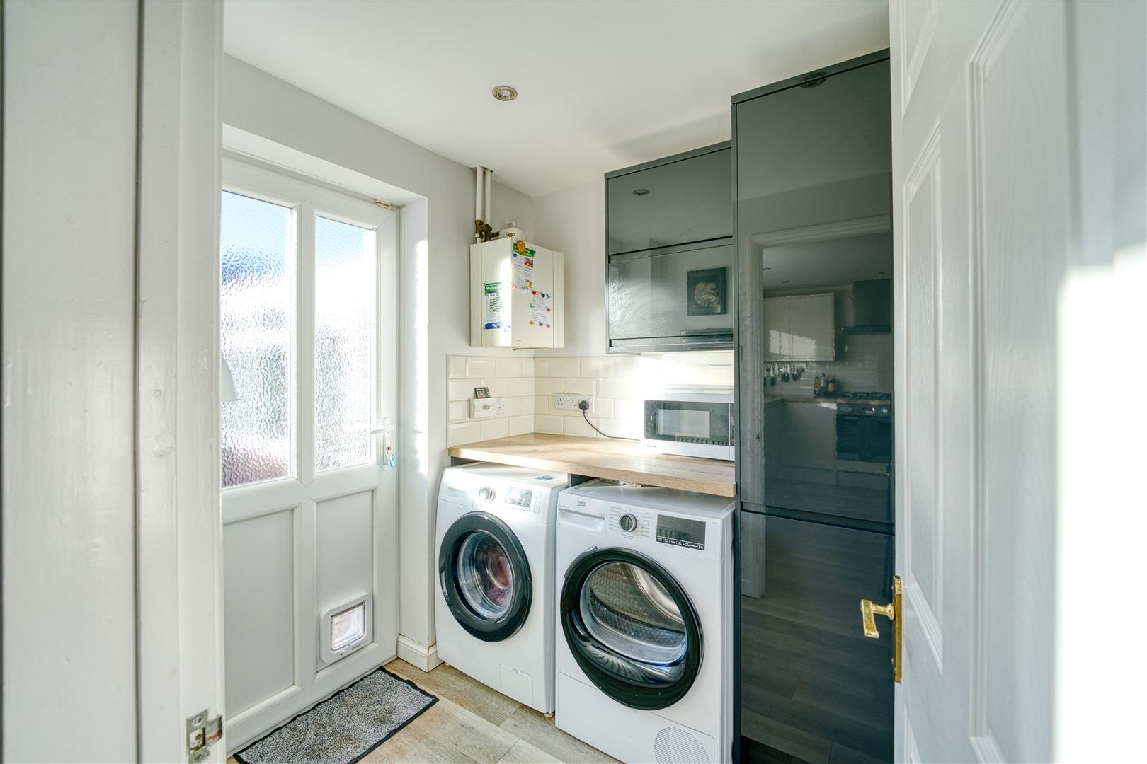 Utility Fitted with a matching range of wall and base units and work surface as those in the Kitchen. Space and plumbing for an automatic washing machine and tumble dryer. Wall mounted Potterton boiler. Radiator, Karndean flooring. and UPVC double glazed door to rear Garden.