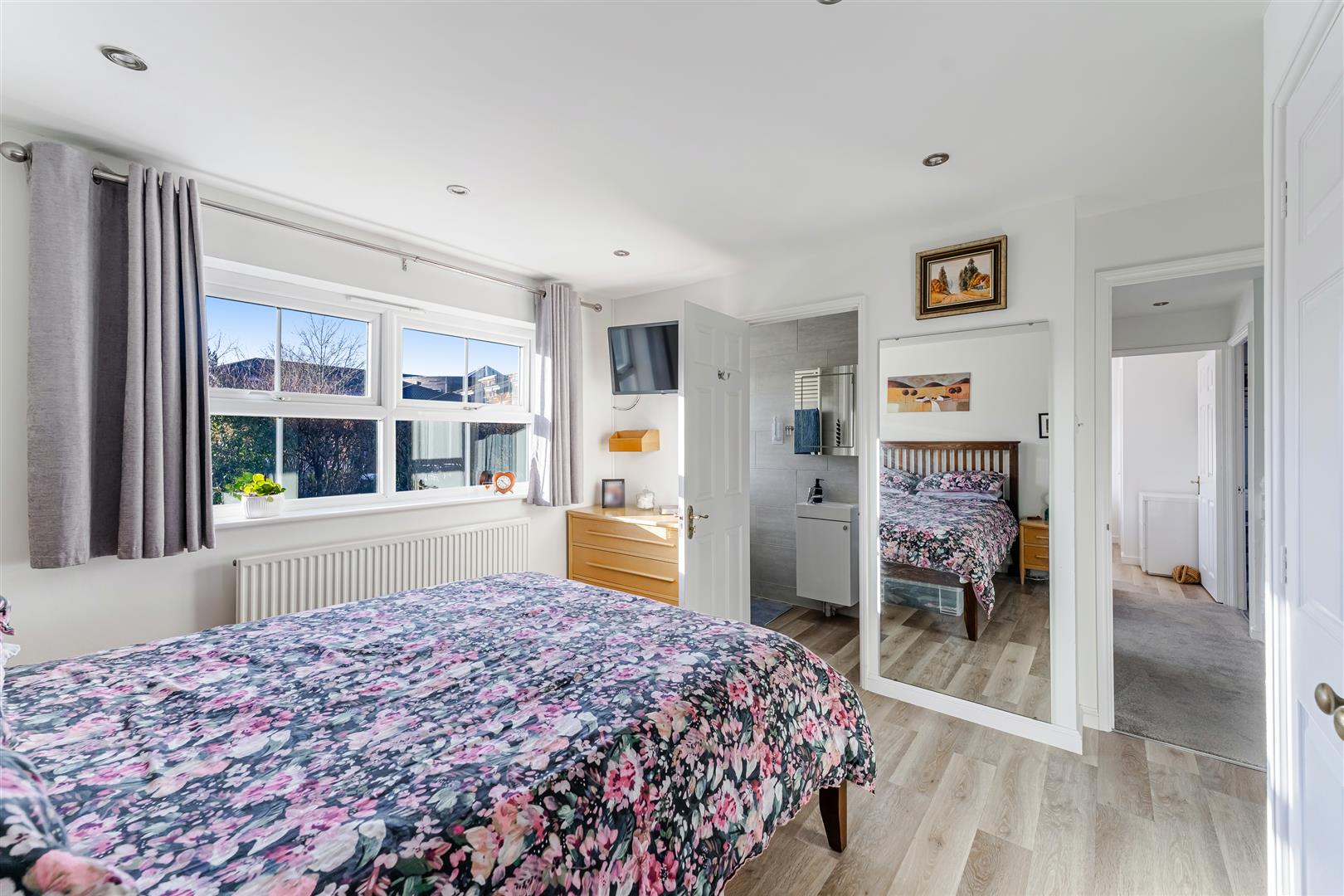 En Suite Fully tiled and fitted with a white suite comprising: Large walk in shower cubicle with thermostatic shower, vanity unit and basin and low level close coupled W.C. Extractor fan, shaver point, heated towel rail and Karndean flooring. UPVC double glazed window to rear.