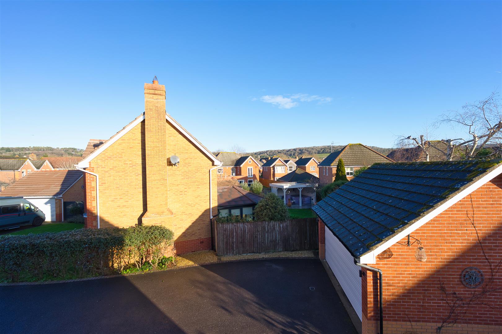 Front Garden Parking for numerous cars over a tarmac driveway, brick block paving, lawn, paved path and 2 gates leading to the rear garden. Door to rear of garage. Outside lighting.