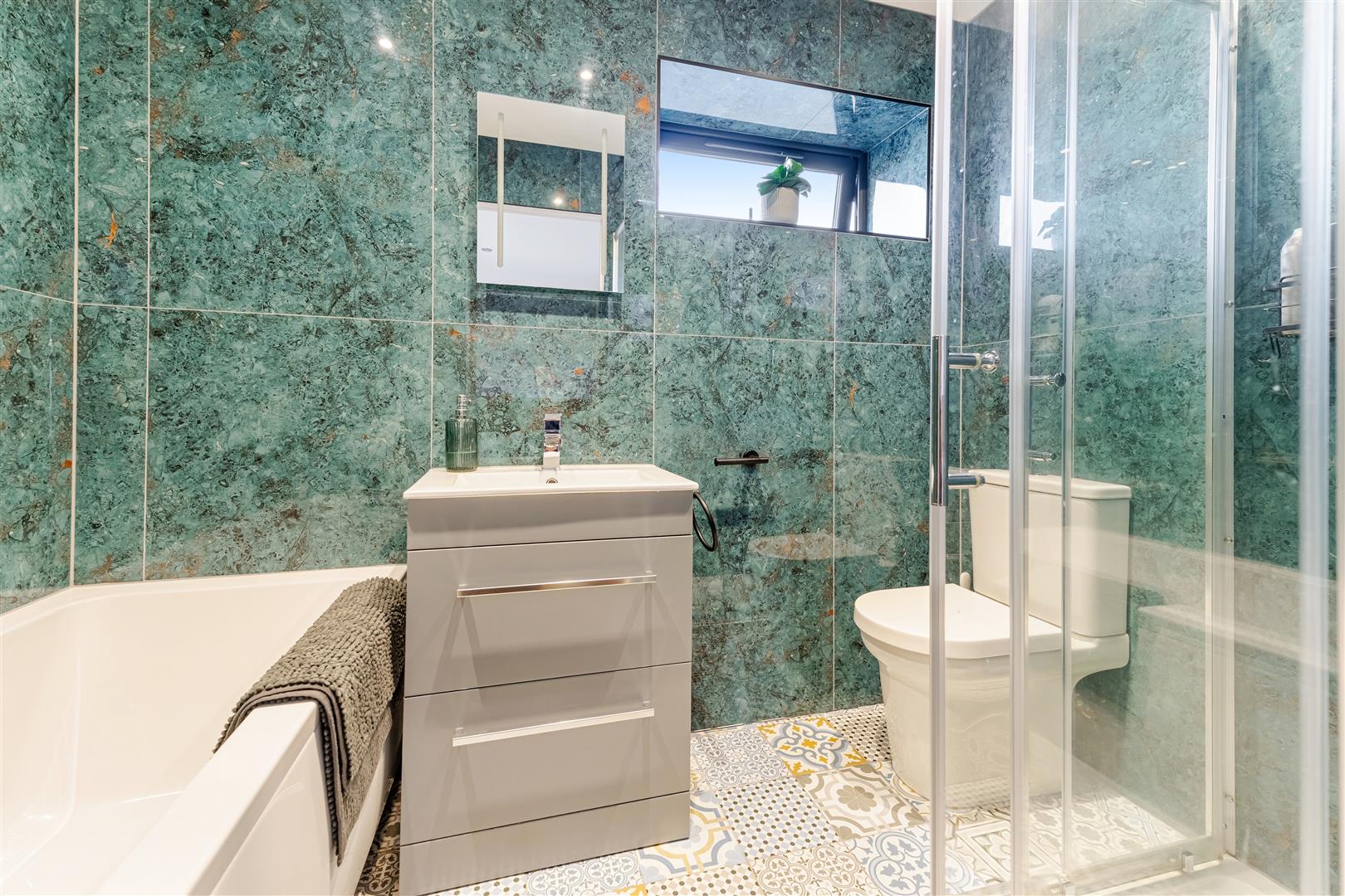 Family Bathroom Fitted with a white suite comprising: Panelled bath with glass screen and shower above. Concealed low level wc and wash hand basin with storage below. Radiator. UPVC double glazed window to the rear.